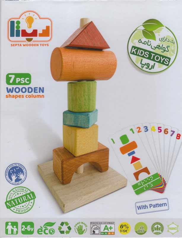 توضیحات بازی ستون اشکال بازی ستون اشکال از شش بلوکه هندسی با رنگهای متفاوت و هشت کارت ، یک ستون و دفترچه راهنما تشکیل شده است. رده سنی بازی برای چند گروه سنی قابل استفاده است. 1. رده سنی ۱۸ ماه که آشنایی با احجام هندسی و رنگ ها را به ارمغان می آورد. 2. رده سنی دو سال که آموزش رنگها به صورت نوشتاری فارسی و لاتین و همچنین آموزش اعداد از یک تا هشت را برای کودکان به همراه دارد. روش بازی : کودک هر بلوکه چوبی را با کارت الگو مطابقت داده و بلوک ها را داخل ستون می‌اندازد. روش چهارم بازی : از ویژگی های این بازی این است که بزرگسالان هم میتوانند از روش سوم بازی استفاده کرده و با چشم بند چشم های خود را بسته و به صورت نوبتی در بازه زمانی مشخص و به طور مثال یک دقیقه برای شناسایی و قرار دادن الگو ها در داخل ستون استفاده کنند. در این روش امکان بازی از ۱ تا ۸ نفر امکان پذیر است. شما سقف امتیاز تعیین کنید به طور مثال عدد ۵۰ ،هر کارت ۶ امتیاز دارد و قرار دادن هر بلوکه اشتباه در ستون یک امتیاز کسر می شود. در هر دور بازی کارت ها برای افراد جابجا کنید، افراد کارت جدیدی را بازی می کنند . به همین ترتیب بازی ادامه پیدا می کند تا جایی که یکنفر به عدد ۵۰ برسد و برنده مشخص می شود. نکته : یک نفر نقش داور و کنترل کننده هر دور بازی را بر عهده می‌گیرد به علاوه او مسئول ثبت امتیاز ها در هر دور بازی می شود. اهداف : 1. افزایش مهارتهای حسی و تقویت هماهنگی دست و چشم. 2. تقویت توانایی حل مسئله و تصمیم گیری. 3. هماهنگی سیستم عصب و عضله. 4. آشنایی با رنگ های متفاوت. 5. آشنایی با نوشتار رنگها به صورت فارسی و لاتین. 6. آشنایی با اعداد از یک تا هشت به صورت فارسی و لاتین. 3. رده سنی ۴ سال در این روش چشمهای کودک را با چشم بند بسته و از او می‌خواهیم فقط با لمس روی هر کار الگو را تشخیص داده و آن را داخل ستون قرار دهد. اهداف : تقویت حس لامسه از طریق بستن چشمها نکته : در این روش امکان بازی برای کودکان نابینا فراهم آمده است . با توجه به خط بریل که به دو زبان فارسی و لاتین که بیانگر رنگ کارت است ،کارت مورد نظر را انتخاب کرده و با توجه به برجسته شدن هر شکل بر روی کارت ها ، کودک مطابق شکل قطعات را با قدرت لامسه تشخیص و در ستون قرار می دهد.