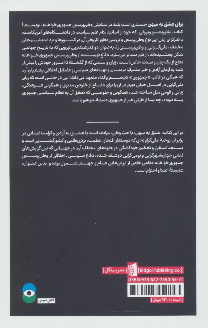 | برای عشق به میهن جستاری است بلند در ستایش وطنپرستی جمهوریخواهانه. نویسندۀ کتاب، مائوریتسو ویرولی، که خود از اساتید بنام علم سیاست در دانشگاههای آمریکاست، با تمرکز بر زبانِ این نوع وطنپرستی و بررسی تطور تاریخی آن در کشورها و نزد اندیشمندان مختلف، ملیگرایی و وطنپرستی را، بهعنوان دو قدرتمندترین نیرویی که به تاریخ جهانی شکل بخشیدهاند، از هم متمایز میسازد. دفاع نویسنده از وطنپرستی جمهوریخواهانه دفاع از یک زبان و سنت خاص است، زبان و سنتی که از گذشته تا امروز خودش را بیش از همه به آرمان آزادی و خیر مشترکِ مردمان و نهادهای سیاسی و فضایل اخلاقی پشتیبانِ آن، که همگی در قالب «جمهوری» تجسم یافته، متعهد میداند؛ این در حالی است که زبان ملیگرایی در اصل خیلی دیرتر در اروپا برای دفاع از خلوص معنوی و همگونی فرهنگی، زبانی و قومیِ ملل ساخته شد، همگونی و خلوصی که تحقق آن به نظام سیاسی جمهوری بسته نبوده، چه بسا از طرقی غیر از جمهوری دستیابتر هم باشد.