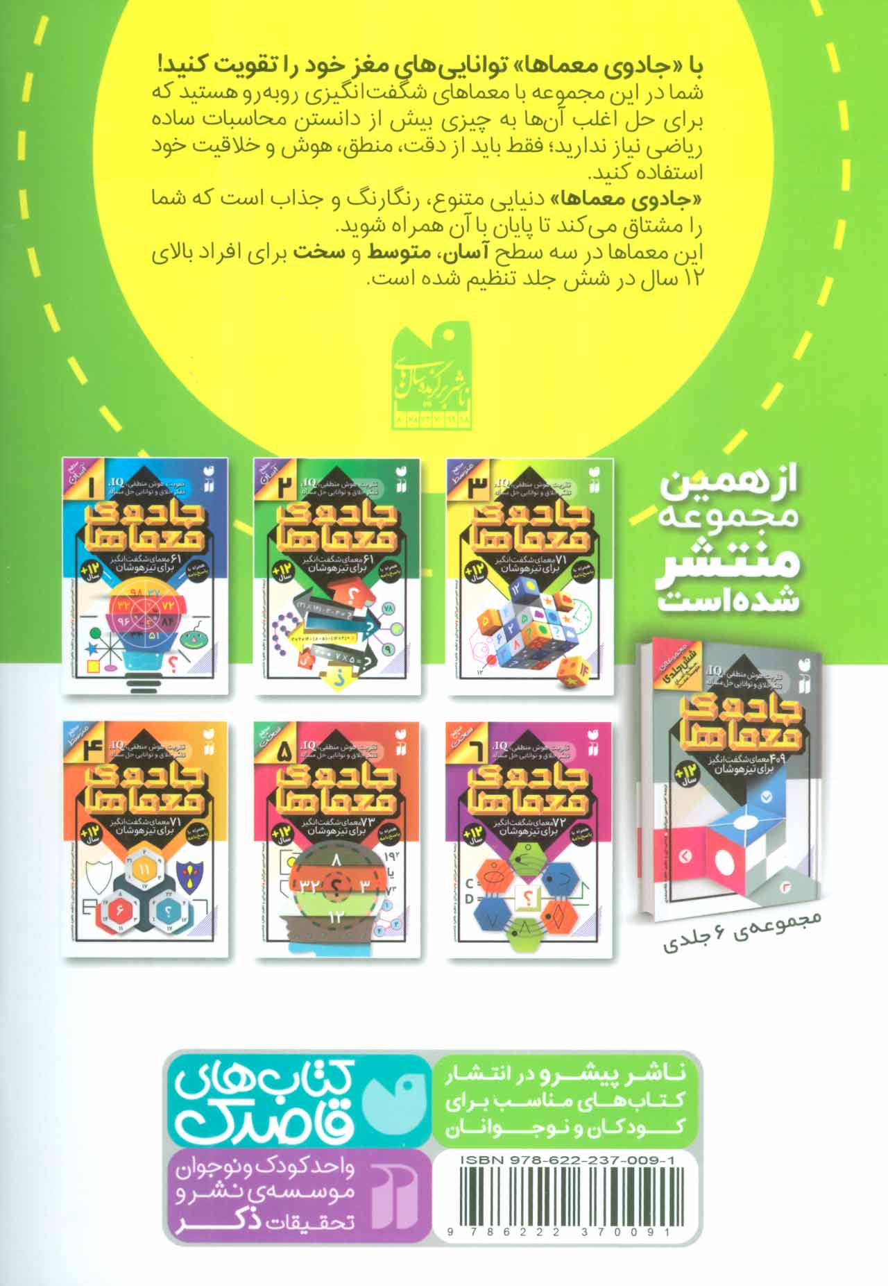 دنیای معما ها دنیایی رنگارنگ متنوع و جذاب است که شمارو تا پایان با خود همراه میکند. این کتاب در سه سطح آسان متوسط و سخت برای سنین 12 سال به بالا در 6 جلد تالیف شده است.
