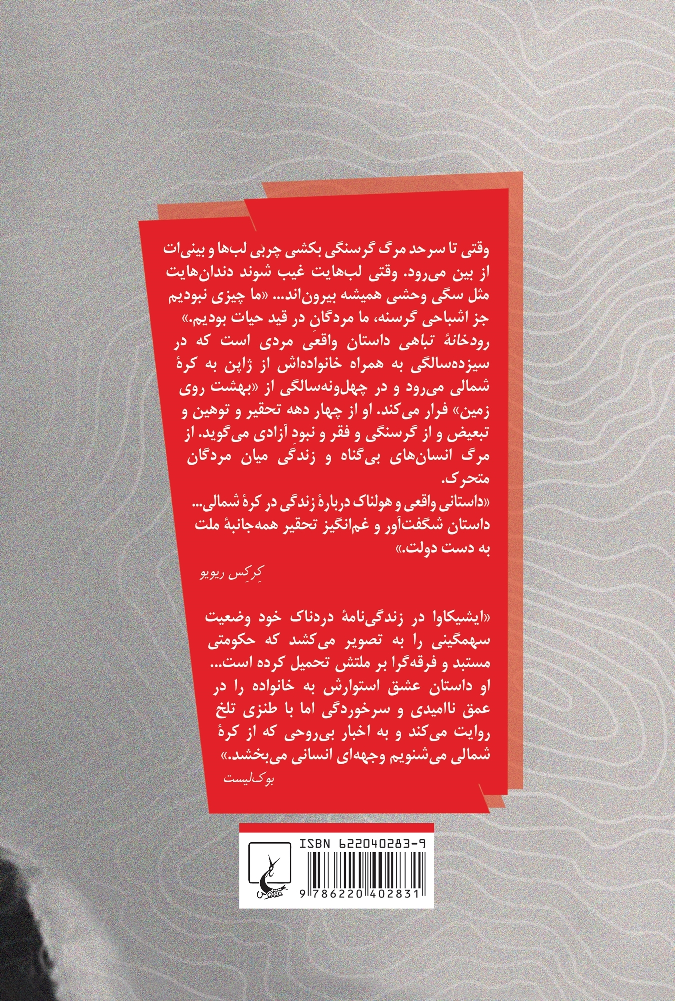 «داستانی واقعی و هولناک دربارۀ زندگی در کرۀ شمالی… داستان شگفت‌آور و غم‌انگیز تحقیر همه جانبۀ ملت به دست دولت.»