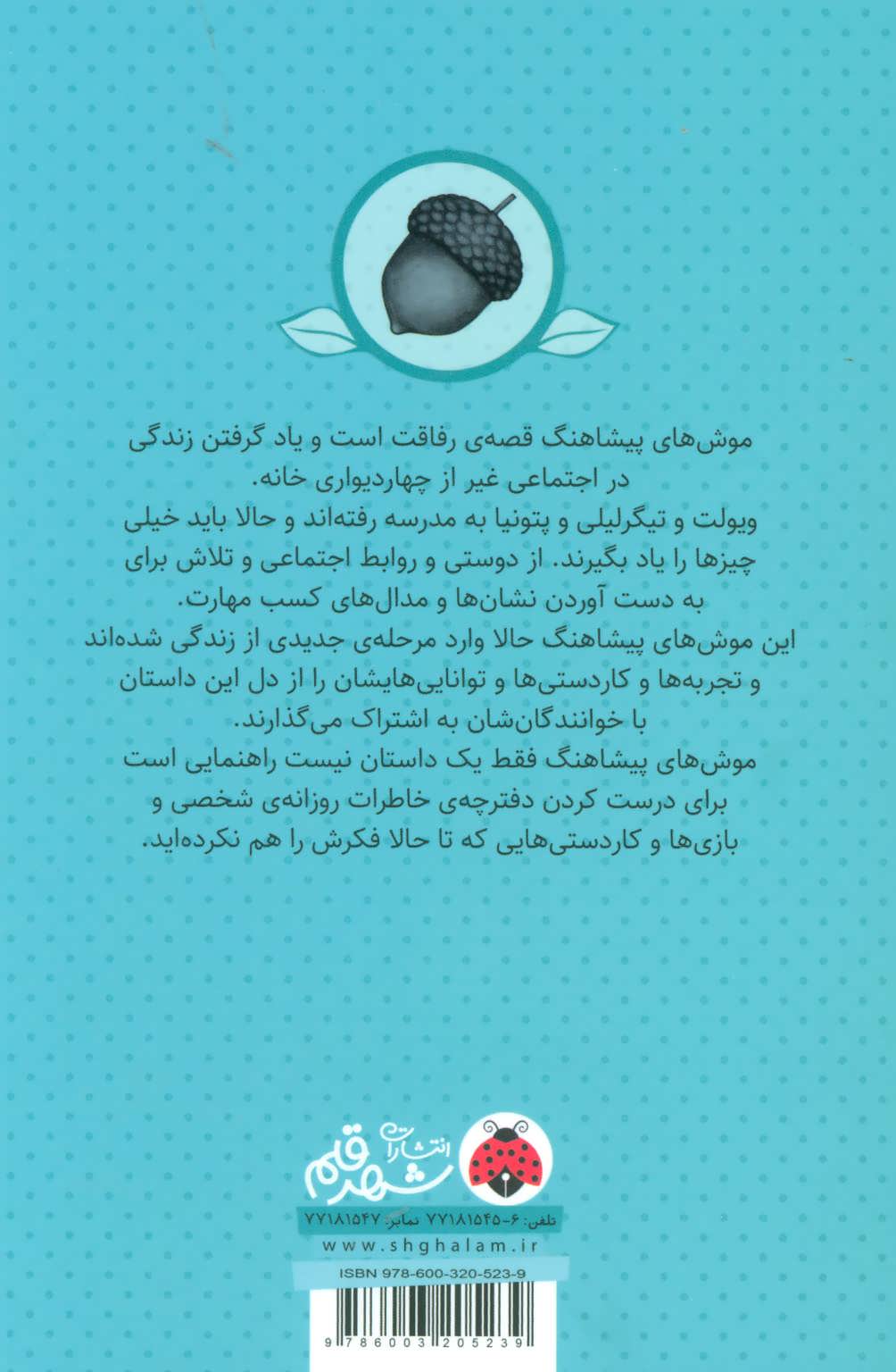 موش هاي پيشاهنگ قصه رفاقت است و ياد گرفتن زندگي در اجتماعي غير از چهار ديواري خانه. ويولت و تيگرليلي و پتونيا به مدرسه رفته اند و حالا بايد خيلي چيزها را ياد بگيرند. از دوستي و روابط اجتماعي و تلاش براي بدست آوردن نشان ها و مدال هاي كسب مهارت. اين موش هاي پيشاهنگ حالا وارد مرحله ي جديدي از زندگي شده اند و تجربه ها و كاردستي ها و توانايي هايشان را از دل اين داستان با خوانندگان به اشتراك مي گذارند.