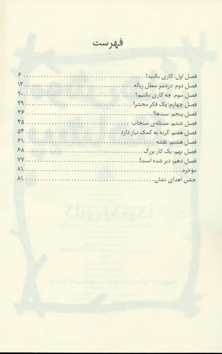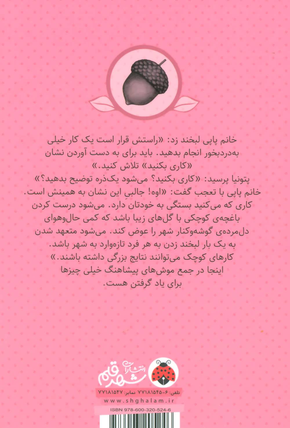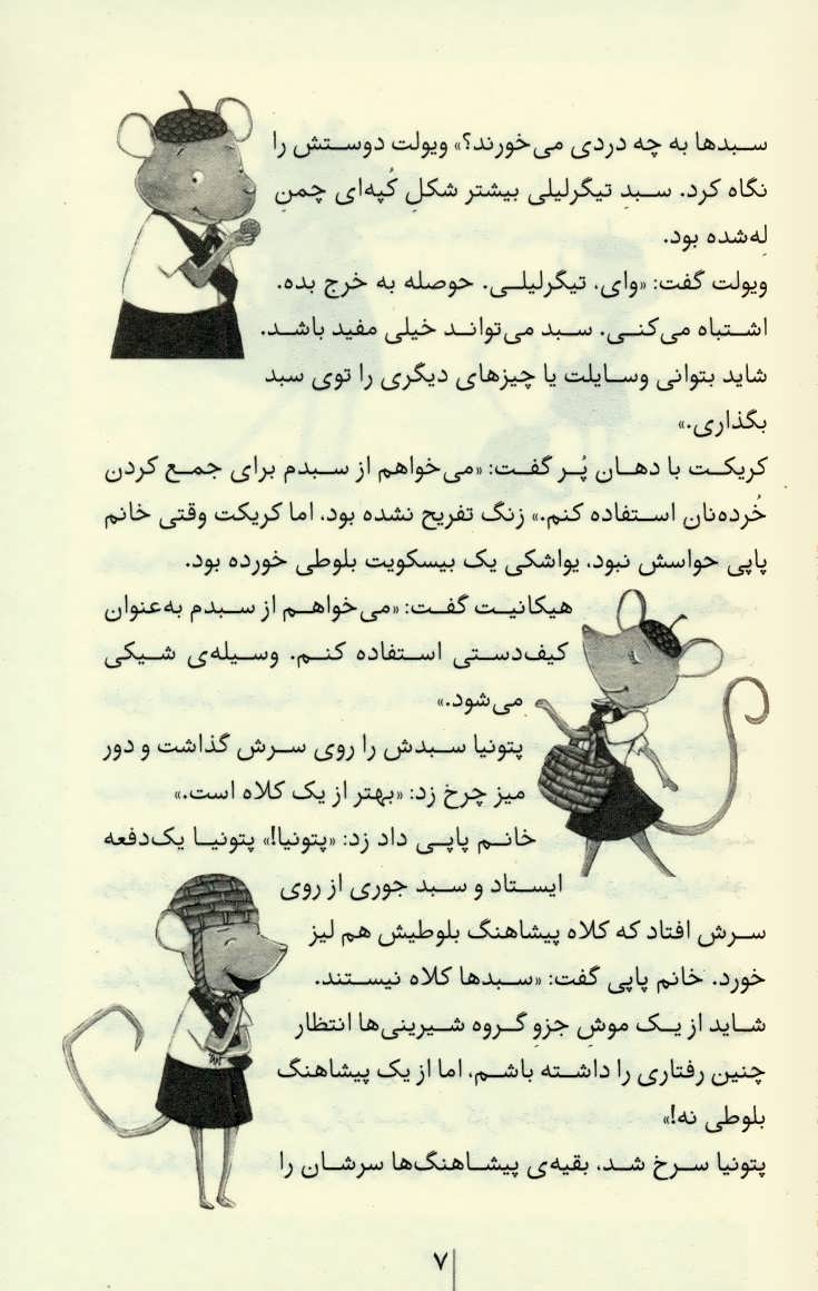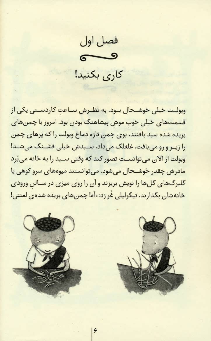 خانم پاپي لبخند زند: راستش قرار است يك كار خيلي به درد بخور انجام بدهيد. بايد براي به دست آوردن نشان كاري بكنيد، تلاش كنيد. پتونيا پرسيد: كاري بكنيد؟ مي شود يك ذره توضيح بدهيد؟ خانم پاپي با تعجب گفت: اوه! جالبي اين نشان به همينش است. كاري كه مي كنيد بستگي به خودتان دارد. مي شود درست كردن باغچه ي كوچكي با گل هاي زيبا باشد كه كمي حال و هواي دل مرده ي گوشه كنار شهر را عوض كند. مي شود متعهد شدن به يك لبخند زدن به هر فرد تازه وارد به شهر باشد. كار هاي كوچك مي تواند نتايج بزرگي به همراه داشته باشند. اينجا در جمع موش هاي پيشاهنگ خيلي چيزها براي ياد گرفتن هست.