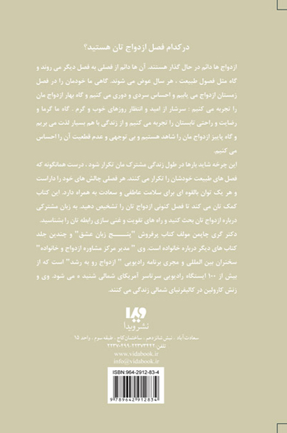 ازدواج ها دائم در حال گذار هستند. آنها دائم از فصلي به فصل ديگر ميروند. گاهي ما خودمان را در فصل زمستان ازدواج مييابيم و احـساس سردي و دوري ميكنيم و گاه بهار ازدواجمان را تجربه ميكنيم: سرشار از اميد و انتظار روزهاي خوب و گرم . گاه ما گرما و رضايت و راحتي تابستان را تجربه مي كنيم و از زندگي با هم بسيار لذت ميبريم و گاه پاييز ازدواجمان را شاهد هستيم و بيتوجهي و عدم قطعيت آن را احساس ميكنيم. اين كتاب كمكتان ميكند تا فصل كنوني ازدواجتان را تشخيص دهيد. به زبان مشتركي درباره ازدواجتان بحث كنيد و راههاي تقويت و غنيسازي رابطهتان را بشناسيد.