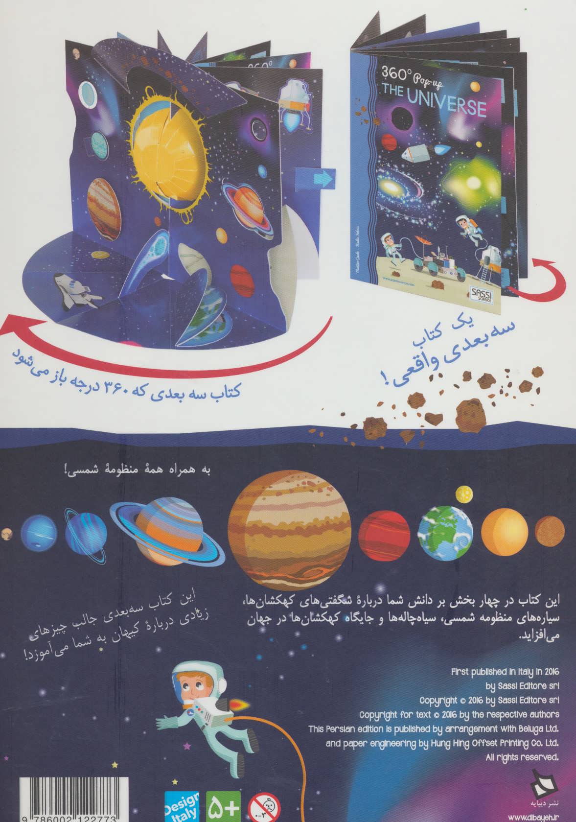 | موضوع | جایگاه کهکشان ها در جهان, شگفتی های سیاره های منظومه شمسی, شگفتی های سیاه چاله ها, شگفتی های کهکشان ها, کتاب ۳۶۰ درجه, کتاب سه بعدی, کودکان و کتاب پاپ آپ |